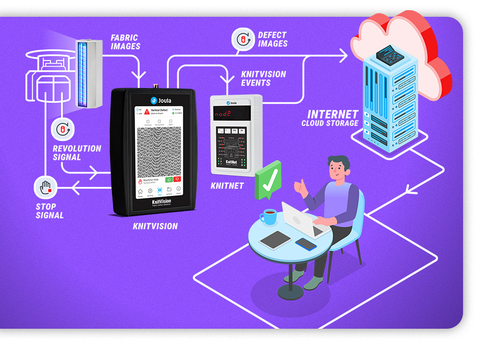Joula KnitVision can now be connected to the Joula KnitNet, which is an advanced online monitoring solution for knitting factories. They work independently, but when they come together, new features and capabilities are achieved. Every fabric defect in the roll is detected, clustered, recorded, and tagged.